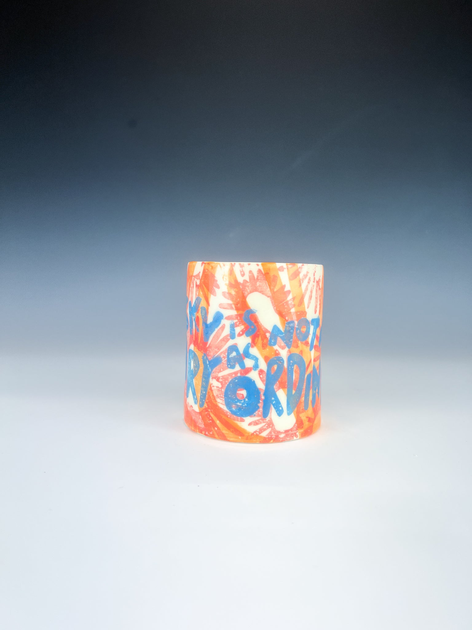 This mug is all about color, pattern, and a little bit of chaos in the best way! Each one is made by hand and screen-printed with layered designs that overlap and mix to create something totally unique. No two are ever the same!